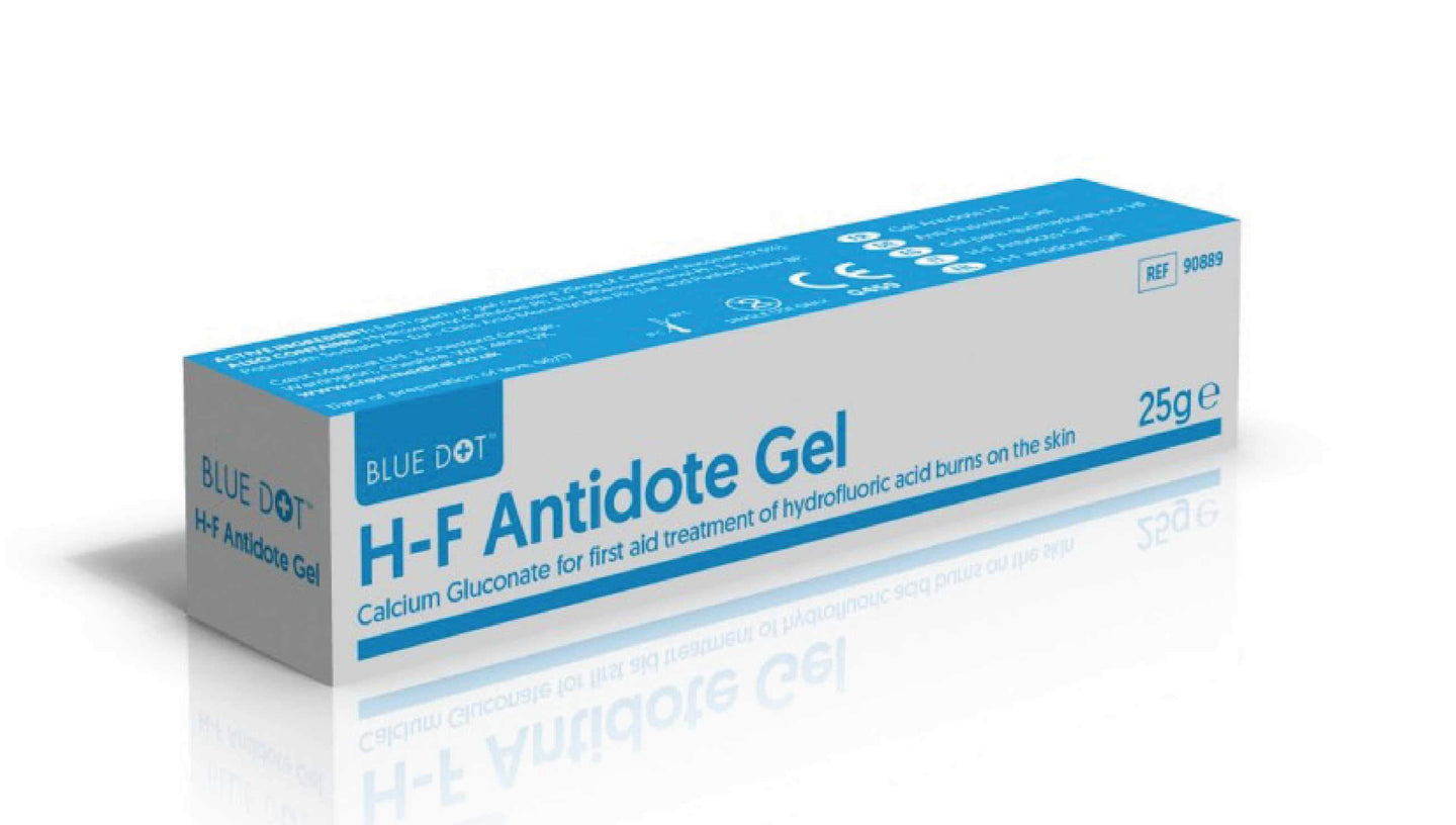 The Blue Dot 25g H-F Antidote Gel is an essential first aid treatment for hydrofluoric acid burns. This gel contains calcium gluconate, which neutralizes fluoride ions, mitigating tissue damage and alleviating pain associated with such burns.