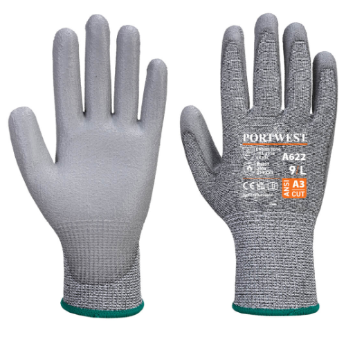 The Portwest A622 MR Cut PU Palm Glove provides level C cut resistance, comfort, and durability, making it ideal for tasks requiring medium-level cut protection and heat resistance.